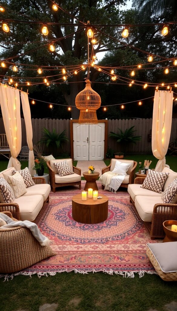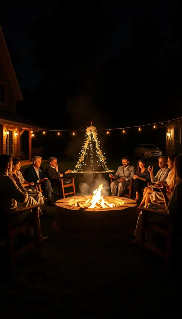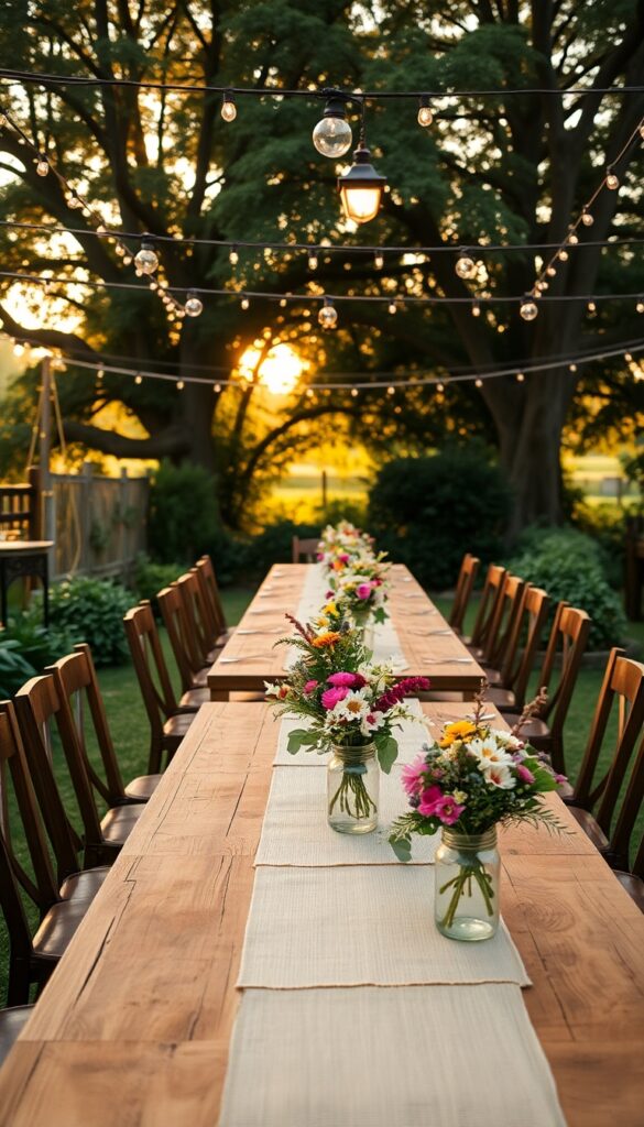 Think wooden tables, burlap runners, mason jar centerpieces, and fresh flowers. Add string lights hanging from trees to create a soft, romantic glow as the sun sets.