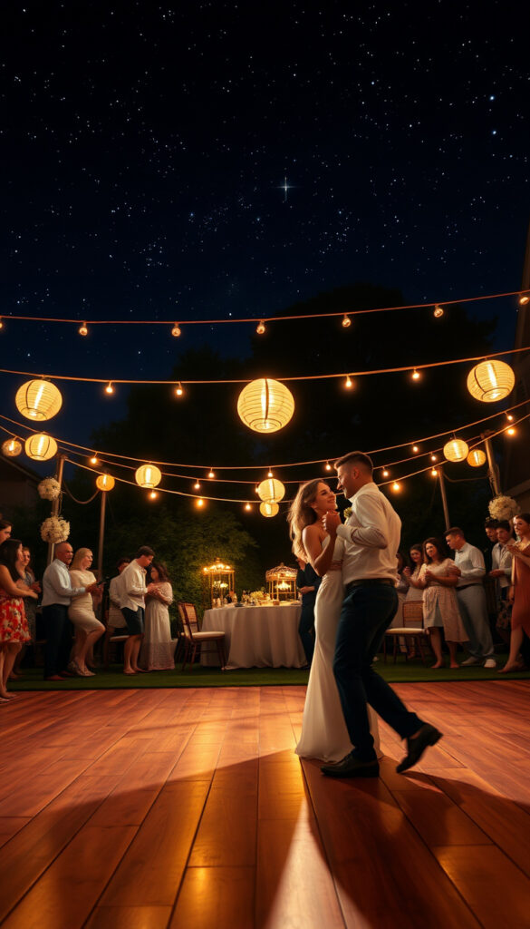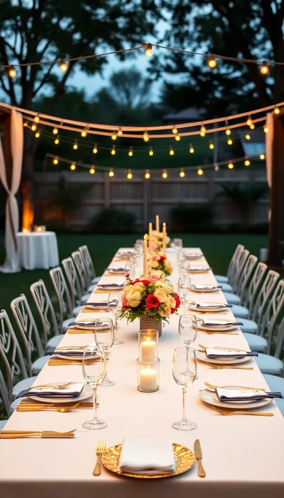 Drape string lights across your yard, over seating areas, or above the dance floor. The soft glow creates a dreamy atmosphere perfect for evening celebrations.