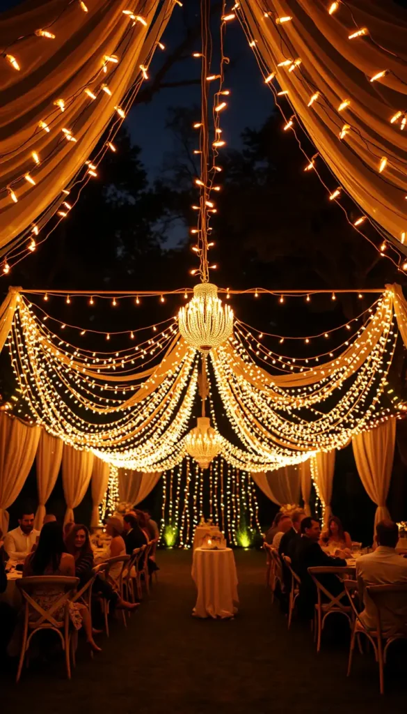Lighting can completely change the mood of your reception. A fairy light canopy is one of the most magical backyard wedding reception ideas.