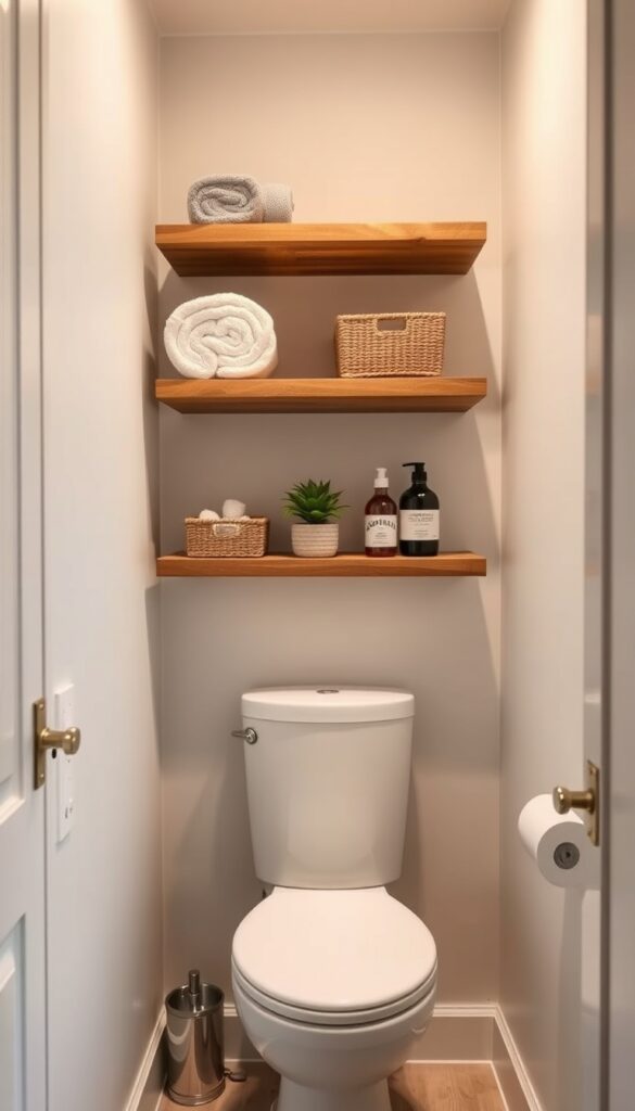 Floating shelves combine practicality with aesthetic appeal, making them a must-have for small bathrooms.
