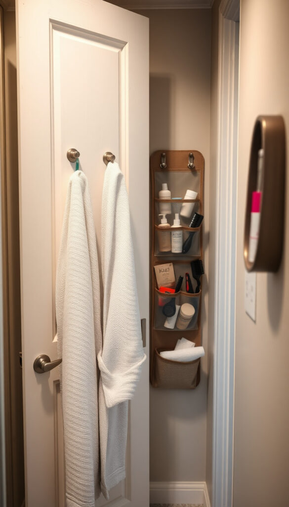 The back of your bathroom door is a hidden storage opportunity that many people overlook. Installing hooks or racks behind the door can instantly create extra space for towels, robes, or even toiletries.