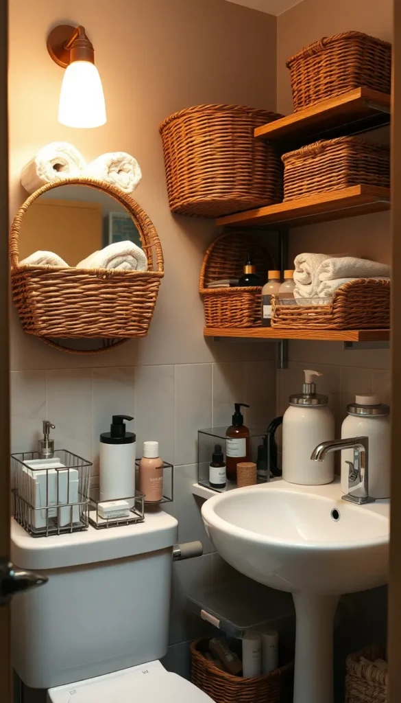No matter how much storage you have, organization is key to keeping your bathroom tidy. Baskets and containers are simple yet powerful tools for managing small spaces.