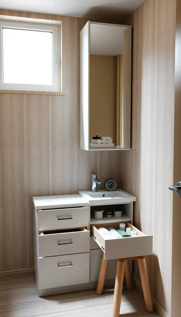 - A vanity with built-in drawers or shelves