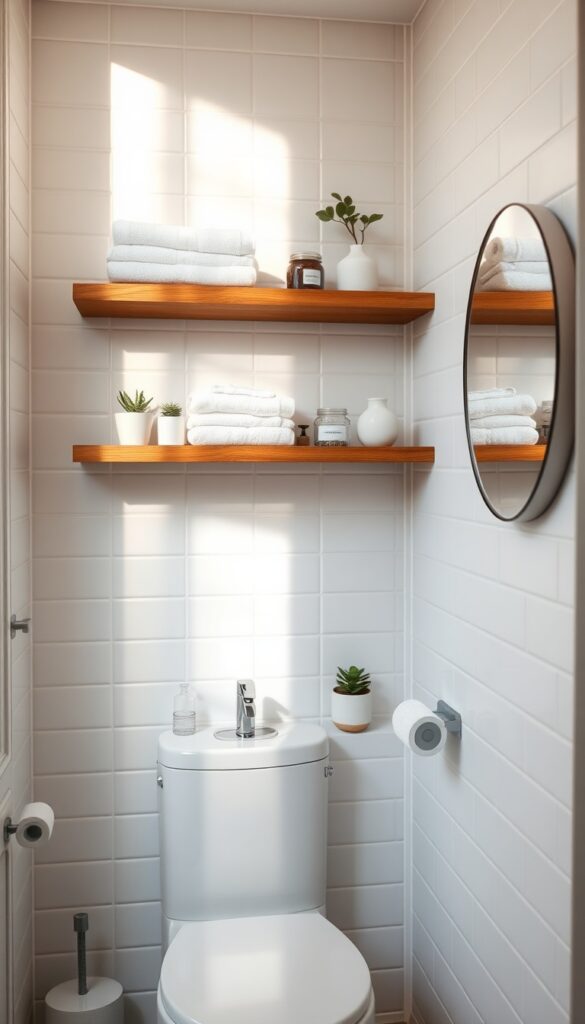 When floor space is limited, the best place to look is upward. Vertical storage is a game-changer for small bathrooms. Installing wall-mounted shelves above the toilet, sink, or door helps you store essentials without crowding the room.