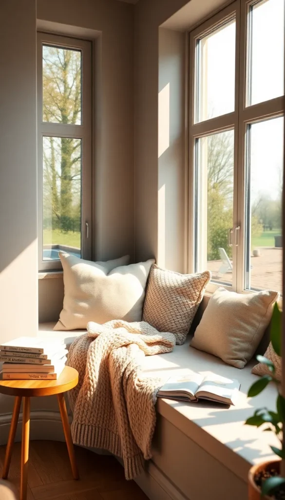 To elevate the ambiance, place a small side table nearby for your books or a cup of tea. Natural light flooding in during the day makes this space ideal for reading, journaling, or simply unwinding.