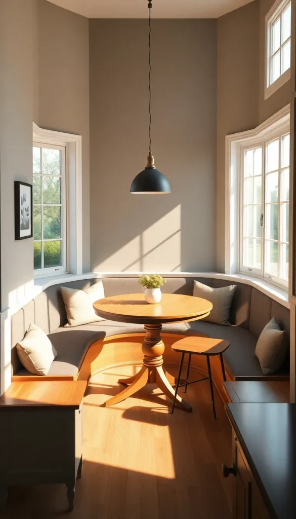 Transform your bay window into a charming dining area. A round or oval table fits perfectly within the curved space, paired with built-in benches or compact chairs.