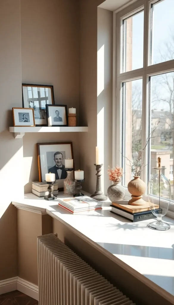 Floating shelves or a simple ledge can help organize your items without overwhelming the space. Rotate decorations seasonally to keep the look fresh and exciting.