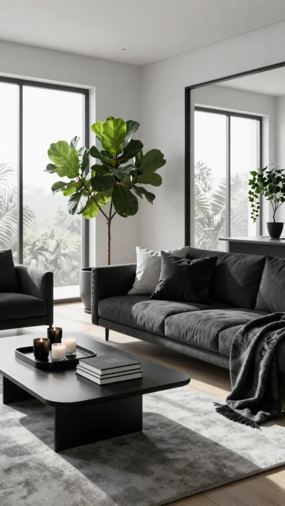 This minimalist approach creates a modern black and white apartment aesthetic that feels both stylish and comfortable.
