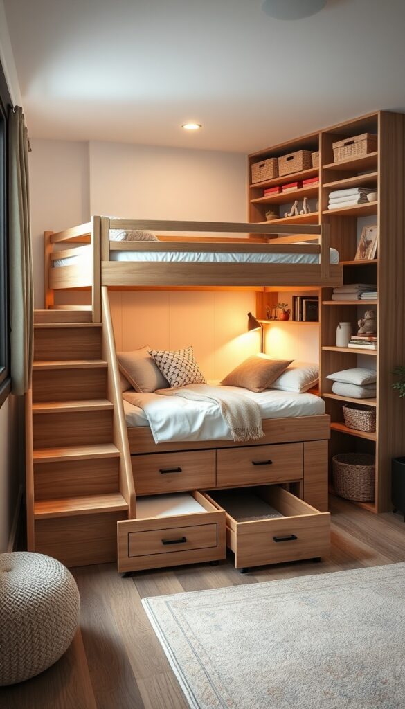 Choose designs with pull-out drawers or staircase storage for added convenience and safety.