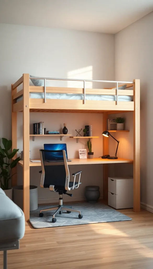 Loft-style bunk beds are ideal for small rooms because they elevate the sleeping area and free up valuable floor space underneath. Instead of placing another bed below, you can create a functional zone such as a study desk, reading nook, or mini office.