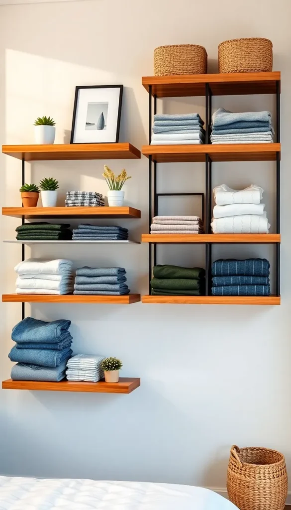 Wall-mounted shelves are a game-changer when you don’t have a dresser.