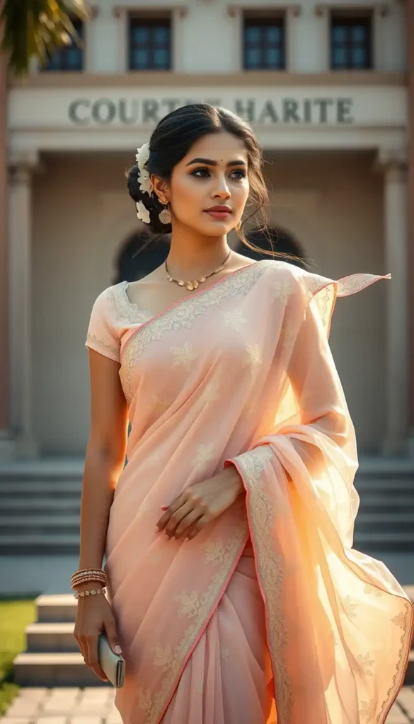 Choose fabrics like chiffon, georgette, or organza. Pair with minimal jewelry and a neat bun decorated with flowers for a soft bridal look.