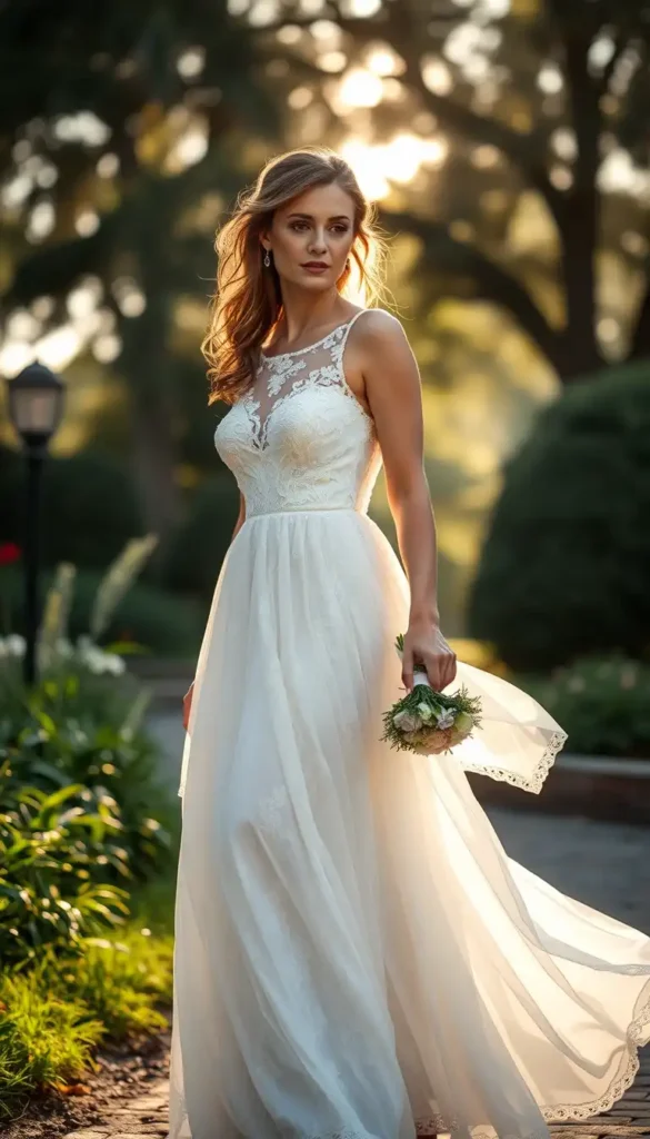 Select a dress with lace or subtle embroidery. Pair with soft waves, nude makeup, and simple heels for a dreamy appearance.