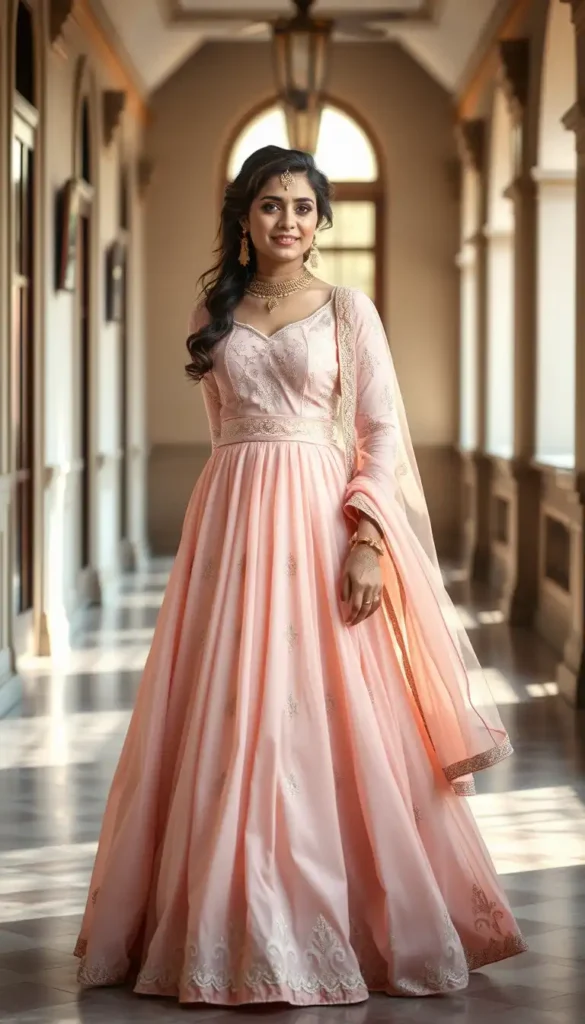 Opt for pastel shades like blush pink, mint green, or ivory. Pair with jhumkas and subtle makeup for a graceful finish.