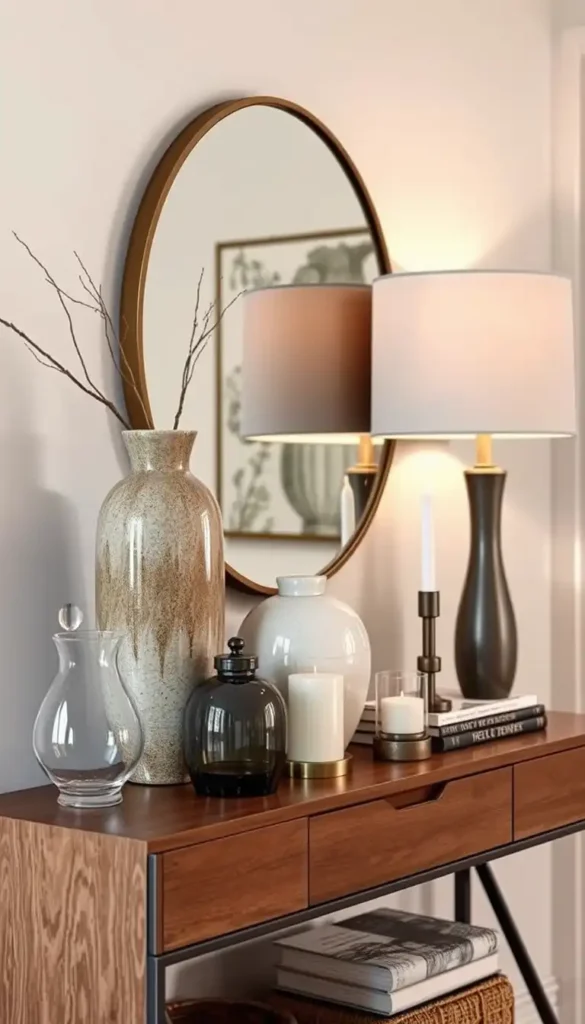 One of the most important styling techniques is mixing different heights and textures. This creates visual interest and prevents your entry table from looking flat or boring.