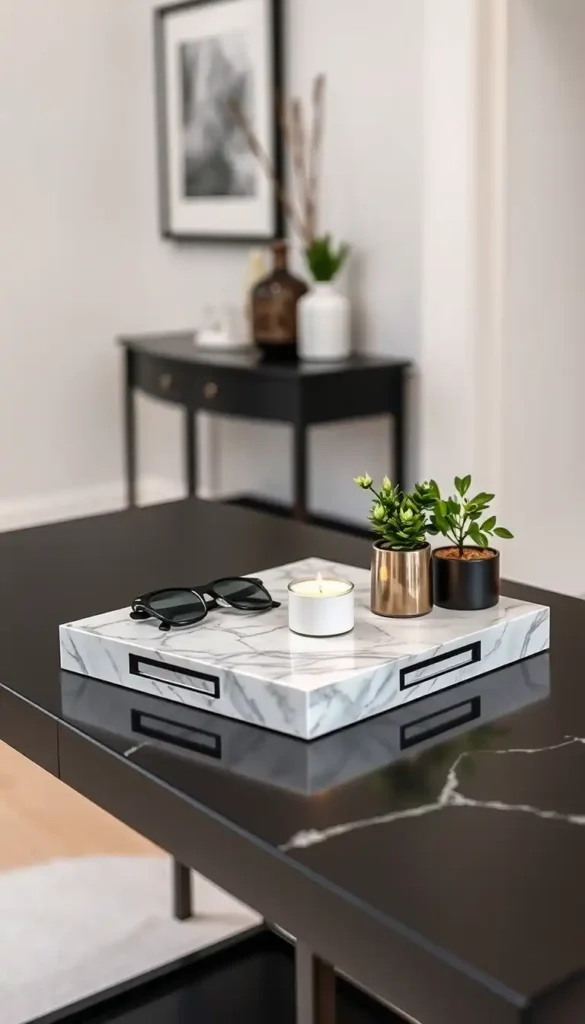 A decorative tray is both stylish and practical. It helps keep small items like keys, wallets, and sunglasses organized while adding a layered look to your table.
