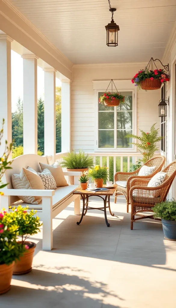 Choose weather-resistant furniture like wicker chairs, wooden benches, or even a porch swing. Add plush outdoor cushions in neutral or seasonal colors for a warm touch. A small side table can complete the look, making it perfect for enjoying tea or chatting with neighbors.