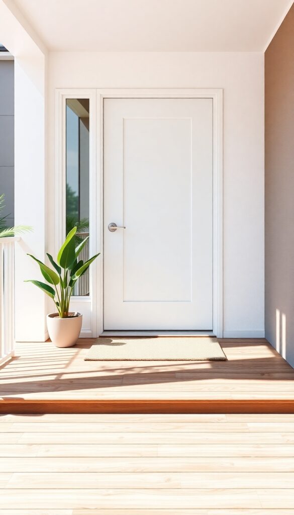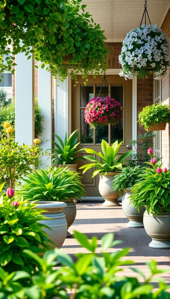 Choose plants suited to your climate and ensure they are easy to maintain. Symmetrical arrangements on both sides of the door create a balanced and polished look.