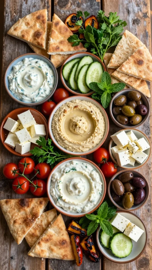 Include items like Hummus, Tzatziki, Pita bread, and Feta cheese.