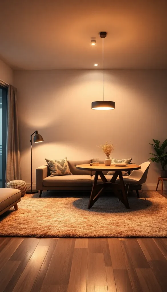 Layering rugs and lighting helps define areas clearly.