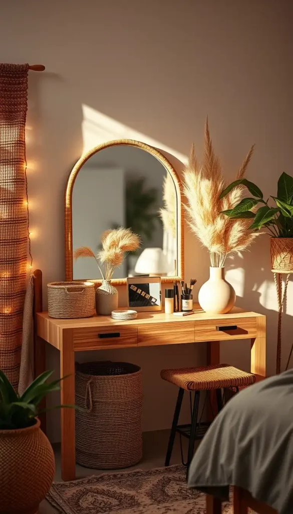 Boho décor has become increasingly popular because of its warm, natural, and relaxed aesthetic. A boho-inspired makeup table combines natural materials with soft textures and earthy tones.