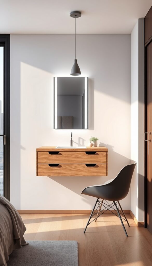 A floating makeup table is attached directly to the wall, creating a sleek and modern appearance. This design is especially useful in minimalist homes and small bedrooms.