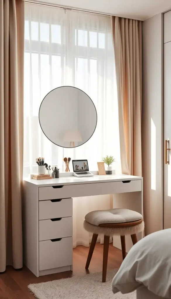This style works especially well in Scandinavian or contemporary bedrooms. Pair the table with a small upholstered stool and soft LED lighting for a cozy beauty setup.