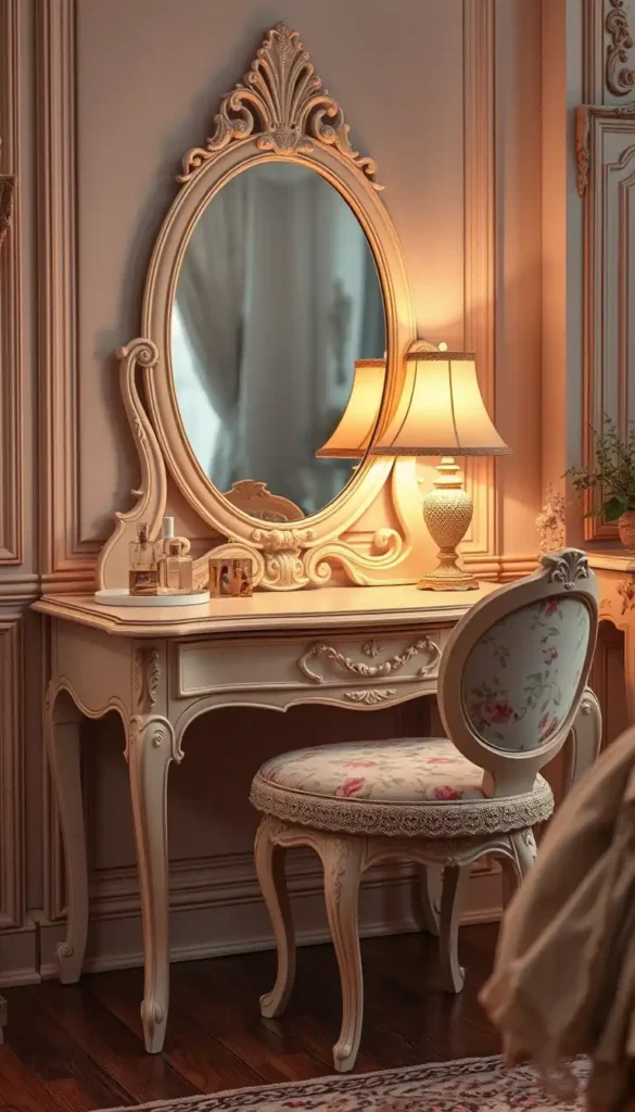 Vintage makeup tables create a romantic atmosphere while offering practical storage.