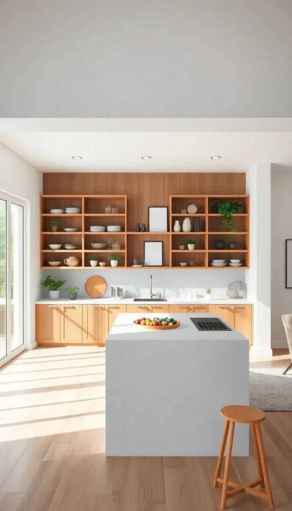 To maintain a clean look, keep shelves organized and avoid overcrowding. This design choice bridges the gap between kitchen and living room decor.