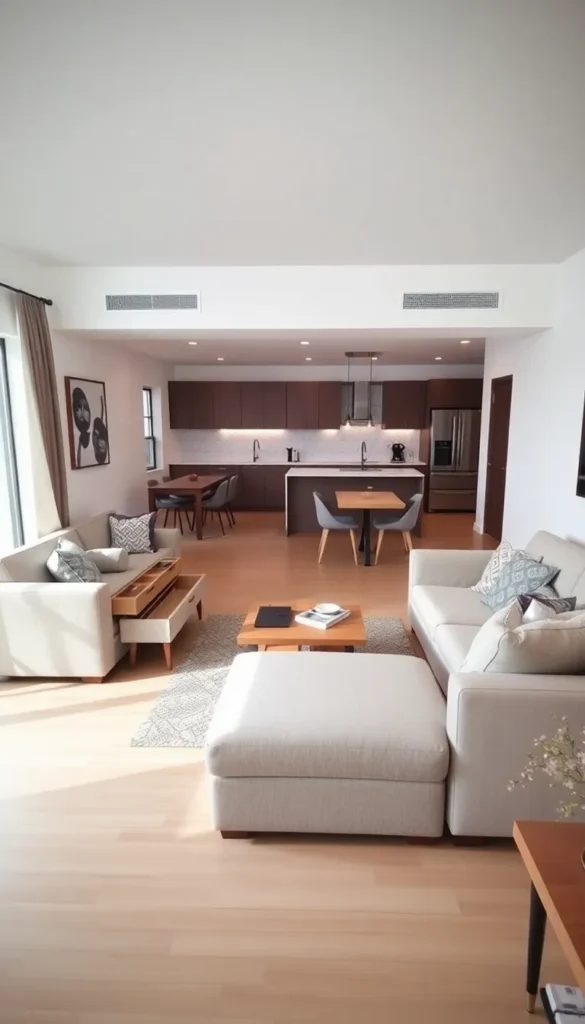 Consider a sofa with built-in storage, a coffee table that doubles as a workspace, or bar stools that tuck neatly under the island. This approach keeps your space organized and adaptable to different needs.