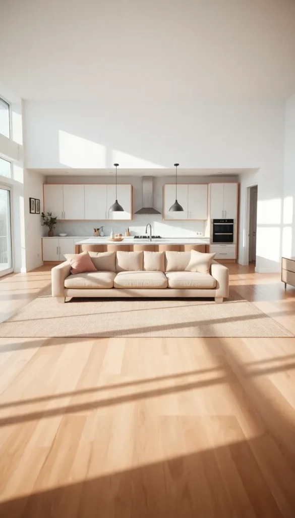 Different flooring styles can subtly separate areas within an open layout. For example, you might use tiles in the kitchen and hardwood or laminate in the living room.