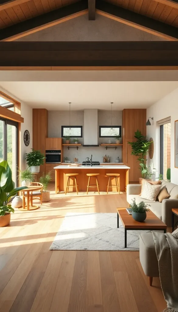 Bringing nature into your home adds warmth and freshness to an open concept kitchen living room. Use indoor plants, wooden furniture, or stone accents to create an inviting atmosphere.