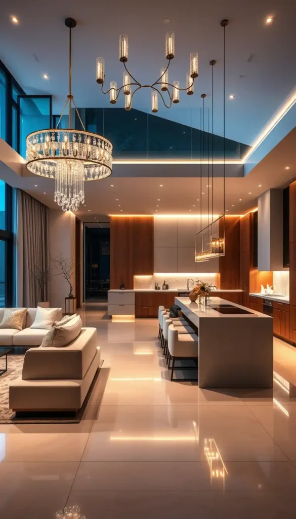 Pendant lights above the kitchen island, a chandelier in the dining space, and floor lamps in the living room can create visual separation while adding personality. Statement lighting fixtures also serve as decorative elements that elevate the overall design.