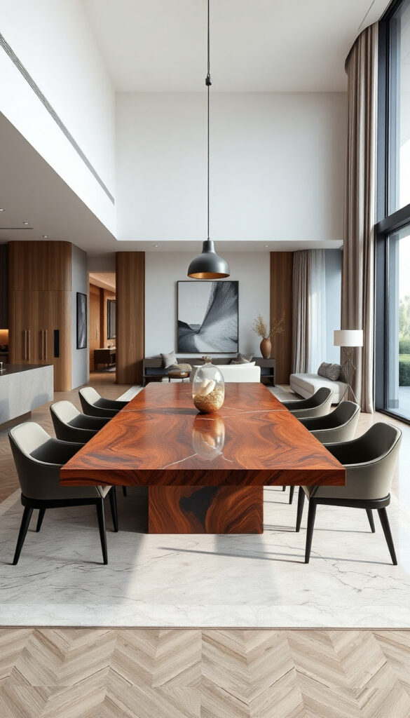 A statement dining set draws attention and anchors the dining area within the larger space.