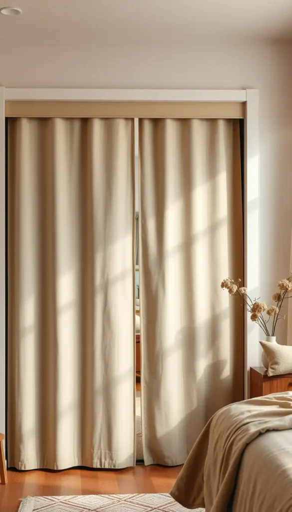 Covering your sliding mirror doors with fabric creates a soft, cozy atmosphere—perfect for bedrooms.