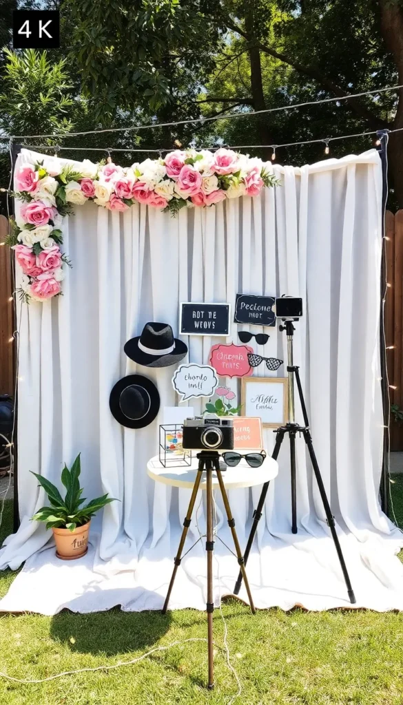 Set up a backdrop using curtains, flower walls, or wooden panels. Provide props like hats, signs, and sunglasses.
