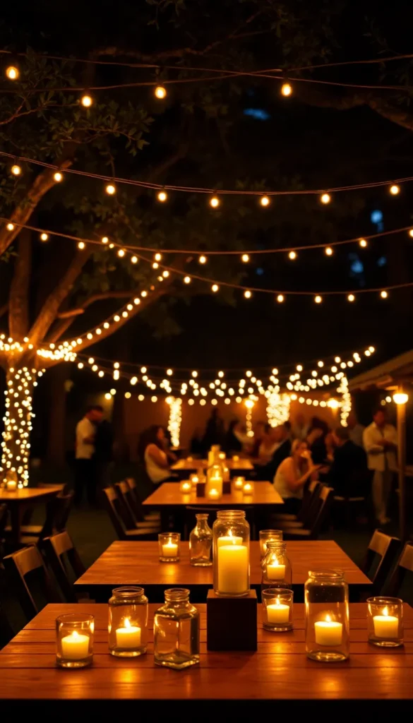 Use long wooden tables or a mix of smaller tables. Decorate them with simple centerpieces like candles, greenery, or mason jars filled with flowers.