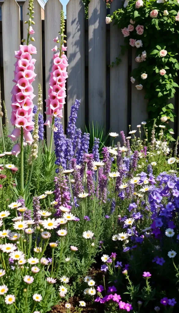 Start with taller plants like hollyhocks or delphiniums at the back, followed by medium-height blooms such as lavender or daisies, and finish with low-growing plants like thyme or creeping phlox at the front. This layered approach not only maximizes your space but also gives your garden a full, abundant appearance.