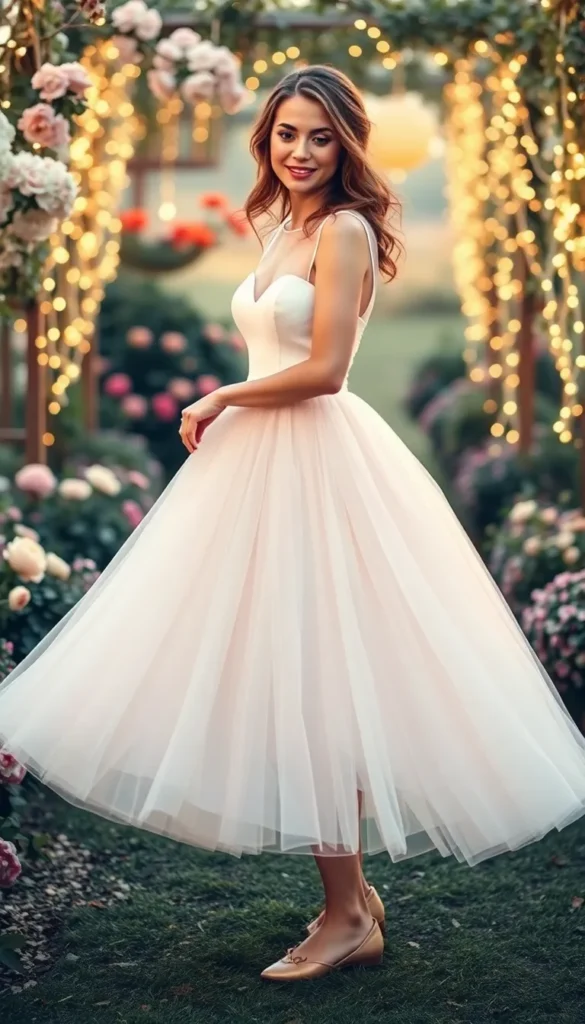 A tulle skirt adds volume and a fairytale-like feel to your tea-length dress. This style combines playful charm with bridal elegance, making it ideal for brides who want a whimsical look.