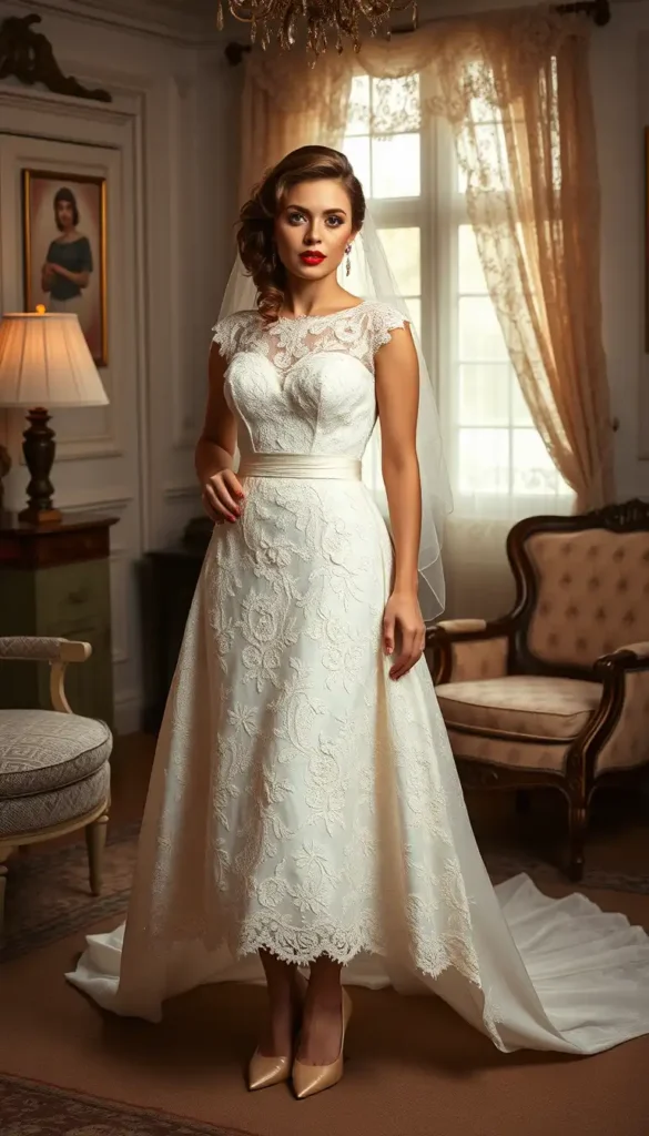 If you love retro fashion, a vintage lace tea-length dress is the perfect choice. Inspired by the 1950s, this style often features intricate lace detailing, illusion necklines, and full skirts.