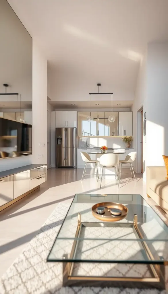 Mirrors are a powerful design tool for small spaces. They reflect light and create the illusion of depth, making your tiny open kitchen and living room feel bigger.
