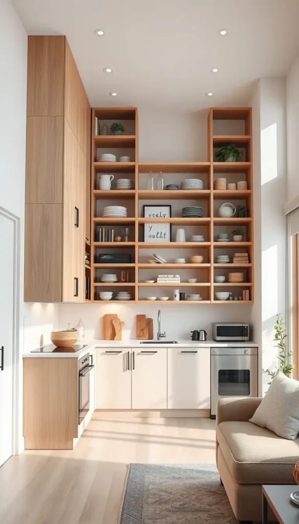 When floor space is limited, think vertically. Utilizing wall space is key in a tiny open kitchen and living room.