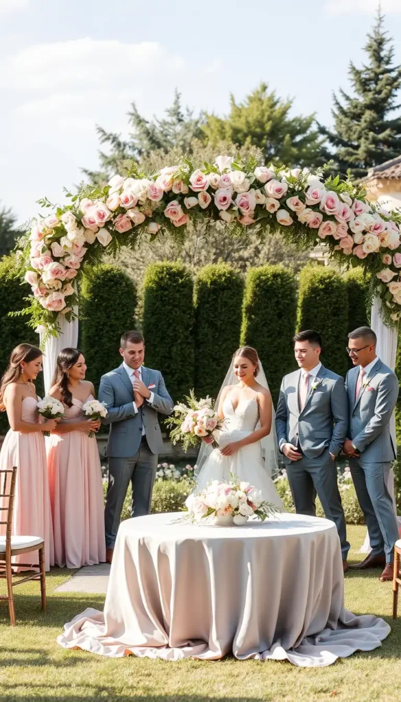 - Bridesmaids in blush dresses and groomsmen in grey suits