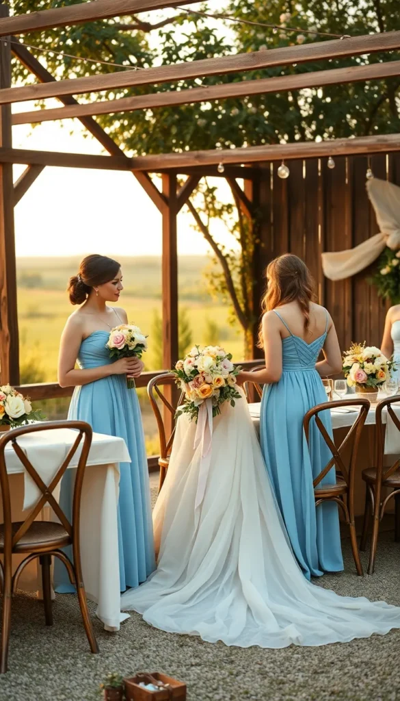 - Bridesmaids in dusty blue and florals with peach accents