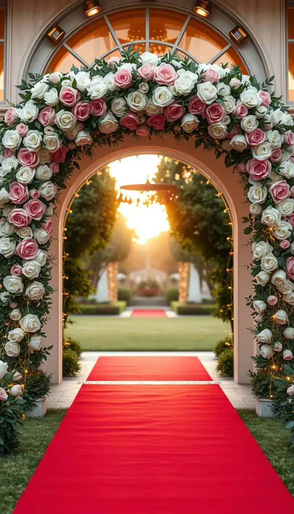 You can also mix greenery like eucalyptus or ivy for a natural, luxurious look. Add fairy lights for evening weddings to make the entrance glow beautifully.