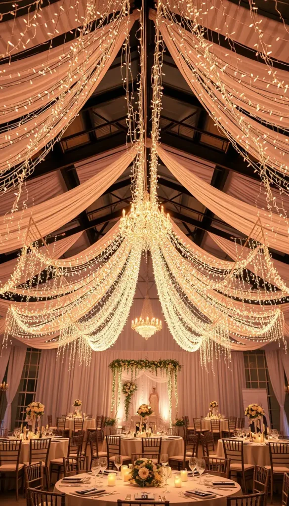 You can combine lights with sheer fabric or flowers for an even more elegant effect. This idea works especially well for nighttime receptions.