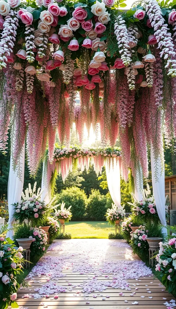 A floral canopy made with hanging flowers and greenery creates a breathtaking outdoor wedding setup.