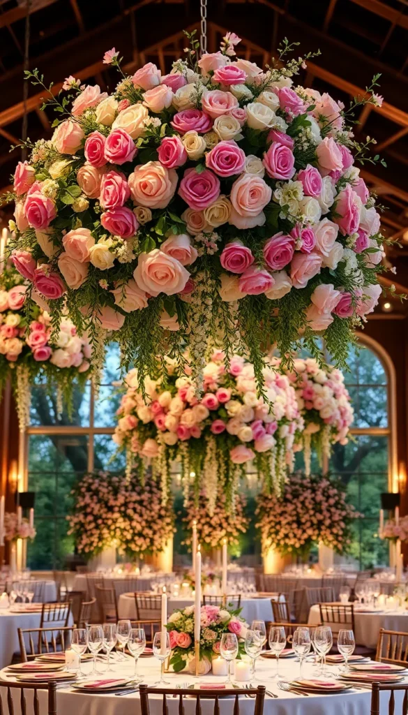 Instead of traditional lighting, use hanging floral chandeliers made with fresh or artificial flowers.