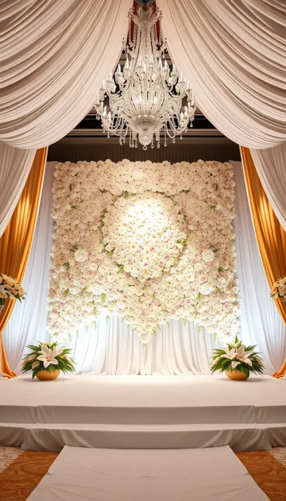The stage is the focal point of the wedding ceremony. Use elegant drapes in white, gold, or pastel shades combined with floral walls or chandeliers.