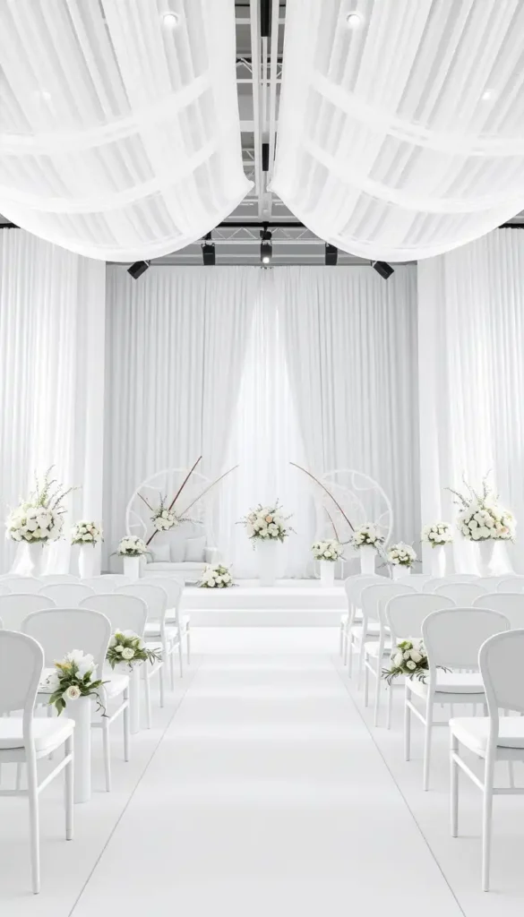 A white-themed wedding is timeless and elegant. Use white flowers, white drapes, and simple décor elements.